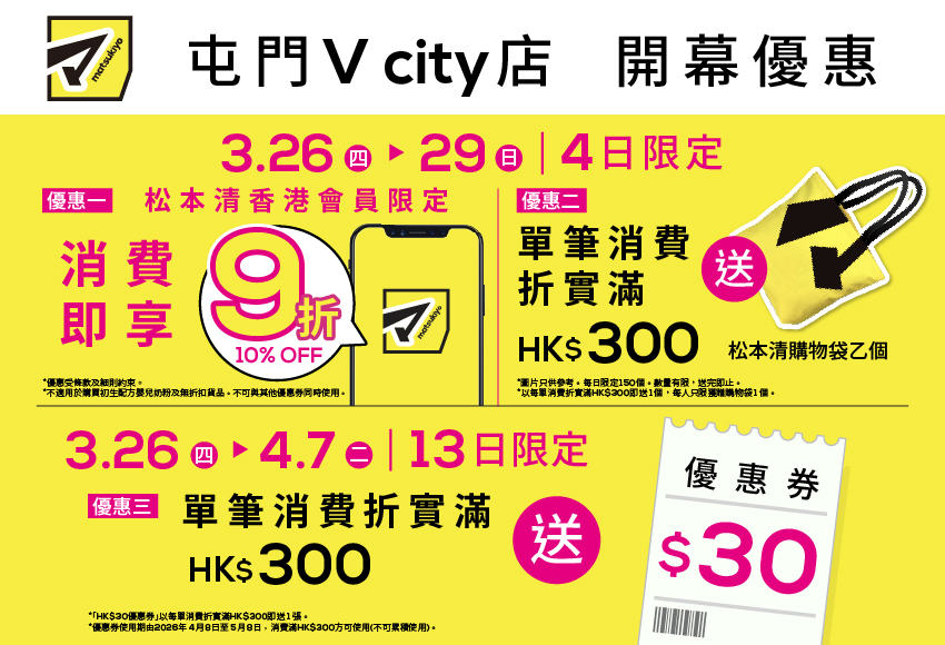 屯門V city店於2026年3月26日(星期四)盛大開幕!由開幕日起推出以下開幕限定優惠: